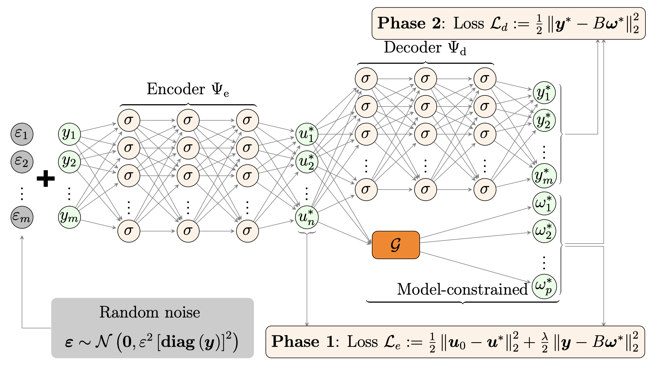 where \(\Psi_e\) and \(\Psi_d\) are encoder and decoder networks, \(\mathbf{P}\) and \(\mathbf{Y}\) are training parameter and observation data, \(\mathcal{F}\) is the forward model (PDE solver), \(\mathbf{B}\) is the observation operator, \(\lambda\) is the regularization parameter, and \(\mathbf{u}_0\) is the prior mean of parameters. The key difference of TAEN is that it uses \(\mathbf{u}_0\) instead of ground truth parameters \(\mathbf{P}\), enabling learning from a single observation sample.