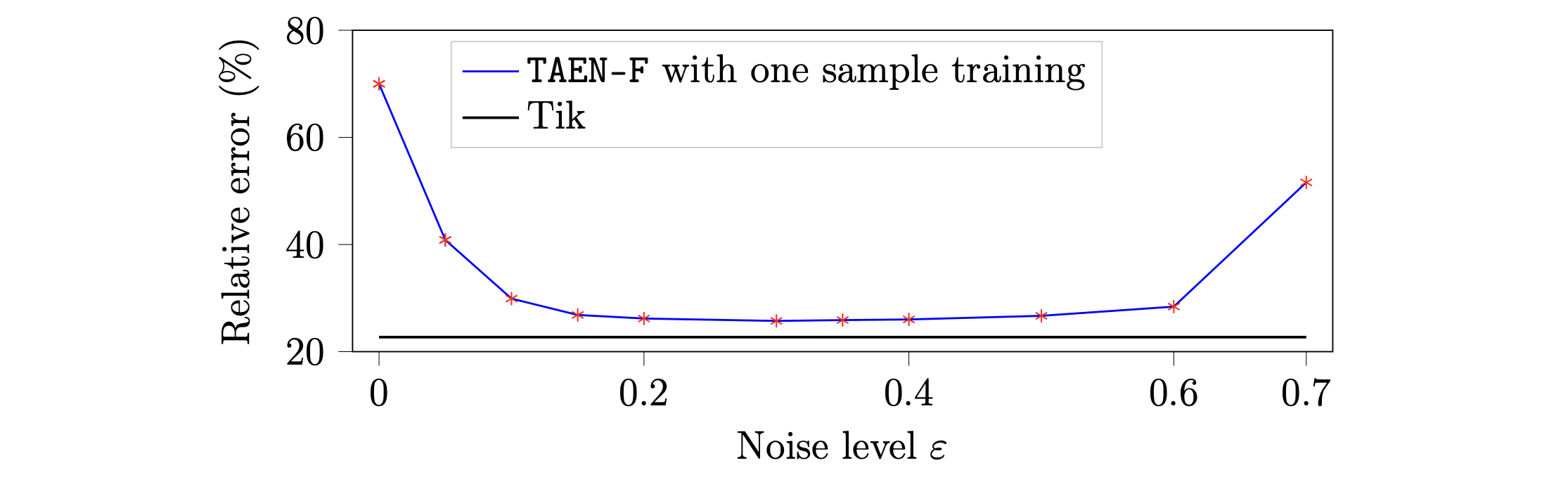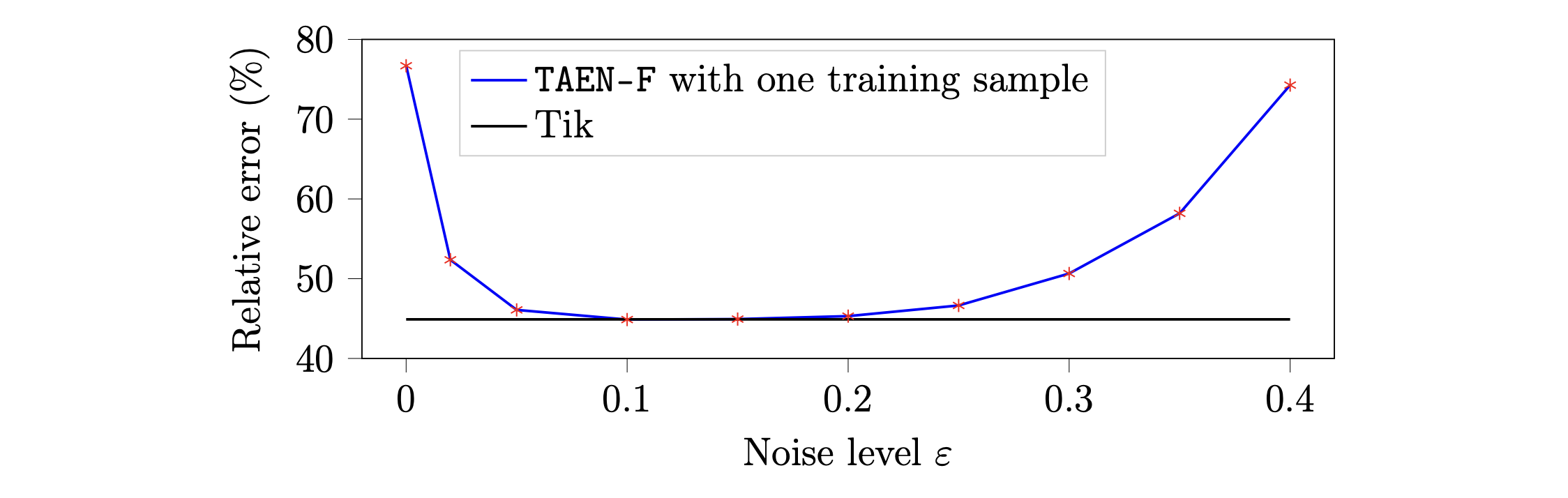 The following table summarizes the average relative error for inverse solutions and forward solutions (observations) over 500 test samples obtained by all approaches trained with {1,100} training samples. The model-constrained approaches are more accurate for both inverse (comparable to the Tikhonov—Tik—approach) and forward solution, and within the model-constrained approaches, TAEN and TAENfull are the most accurate ones: in fact one training sample is sufficient for these two methods.