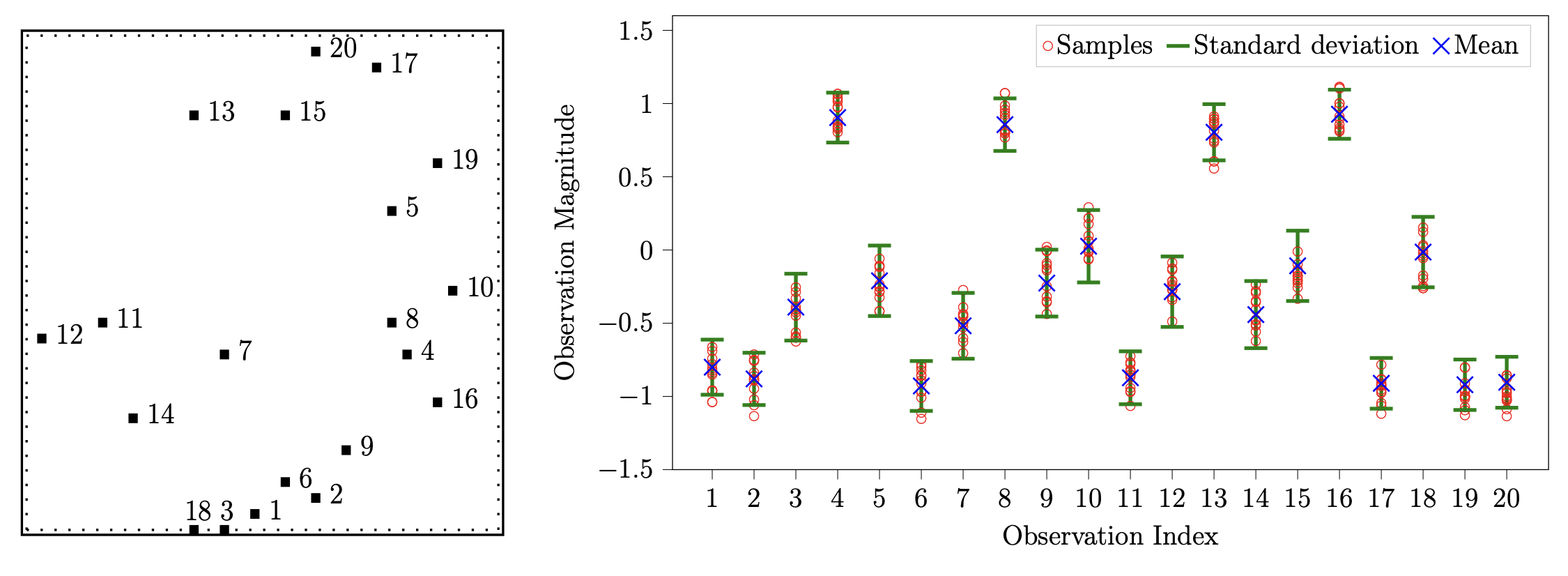 \[\begin{align*} -\nabla \cdot (e^u \nabla \omega) & = 20 \quad \text{in } \Omega = (0,1)^2 \\ \omega & = 0 \quad \text{ on } \Gamma^{\text{ext}} \\ \textbf{n} \cdot (e^u \nabla \omega) & = 0 \quad \text{ on } \Gamma^{\text{root}}, \end{align*}\]where \(u\) represents the (log) conductivity coefficient field (the parameter of interest PoI), \(\omega\) denotes the temperature field, and \(\textbf{n}\) is the unit outward normal vector along the Neumann boundary \(\Gamma^{\text{root}}\). As illustrated in the left panel of Figure 2, we discretize the domain using a \(16 \times 16\) grid, with 10 randomly distributed observation points sampling from the discretized field \(\mathbf{y}_{\text{full}}\).