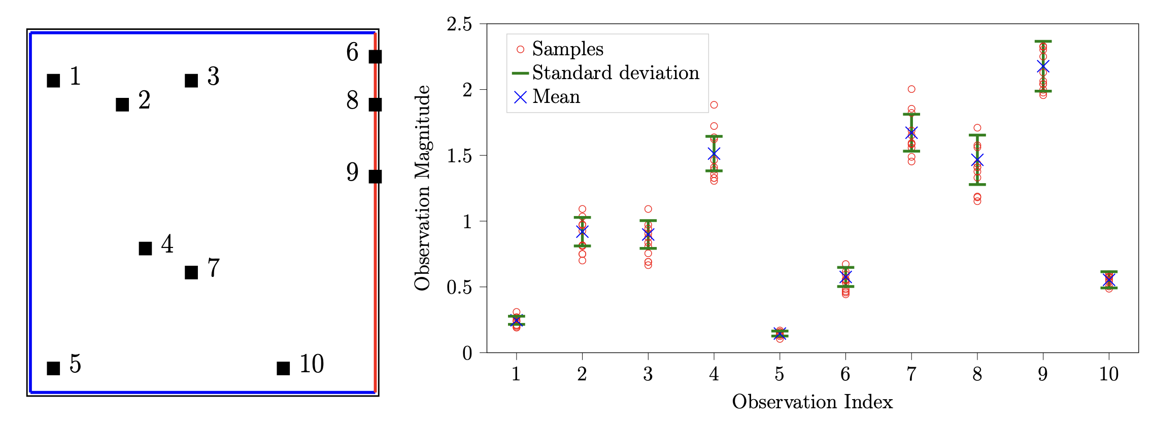 \[u(x) = \sum_{i =1 }^q \sqrt{\lambda_i} \boldsymbol{\phi}_i(x) \mathbf{u}_i, \quad x \in [0,1]^2,\]where \((\lambda_i, \boldsymbol{\phi}_i)\) is the eigenpair of a two-point correlation function, and \(\mathbf{u} = \{\mathbf{u}_i\}_{i=1}^q \sim \mathcal{N}(0,\mathbf{I})\) is a standard Gaussian random vector. We choose \(q = 15\) eigenvectors corresponding to the first \(15\) largest eigenvalues. For each sample \(\mathbf{u}\), we solve the heat equation for the corresponding temperature field \(\mathbf{y}_{\text{full}}\) by the finite element method. The observation samples \(\mathbf{y}^{\text{clean}}\) are constructed by extracting values of the temperature field \(\mathbf{y}_{\text{full}}\) at the 10 observable locations, followed by the addition of Gaussian noise with the noise level of \(\delta = 0.5\%\). Our training dataset consists of 100 independently drawn sample pairs. For the inference (testing) step, we generate 500 independently drawn pairs \((\mathbf{u}, \mathbf{y}_{\text{full}})\) following the same procedure discussed above.